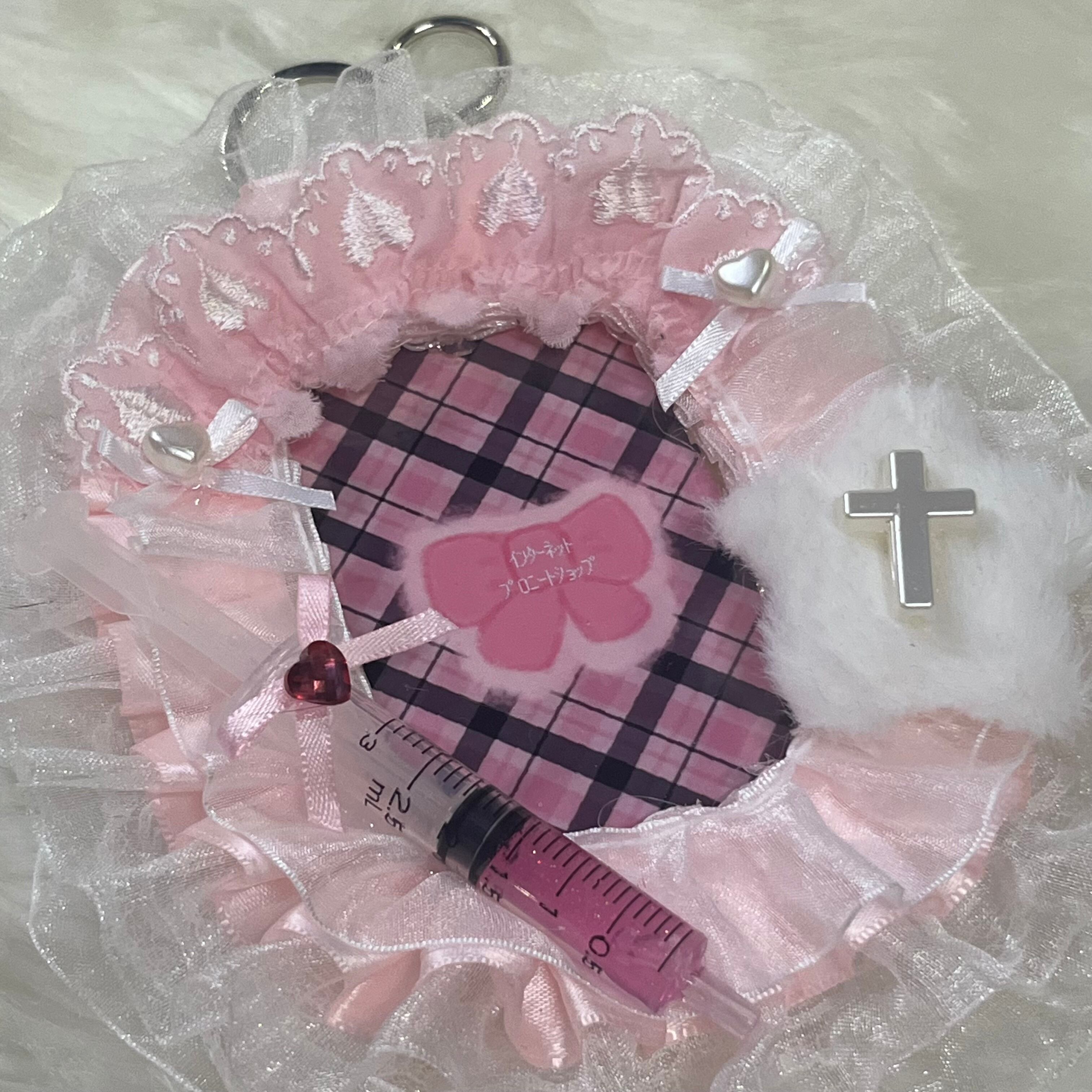 ピンクのお注射モチーフを付けたトレカケースです。注射器の中身は硬化済みのレジンです。